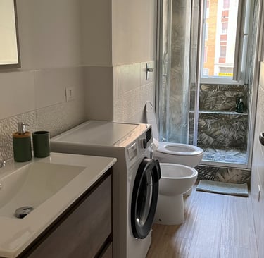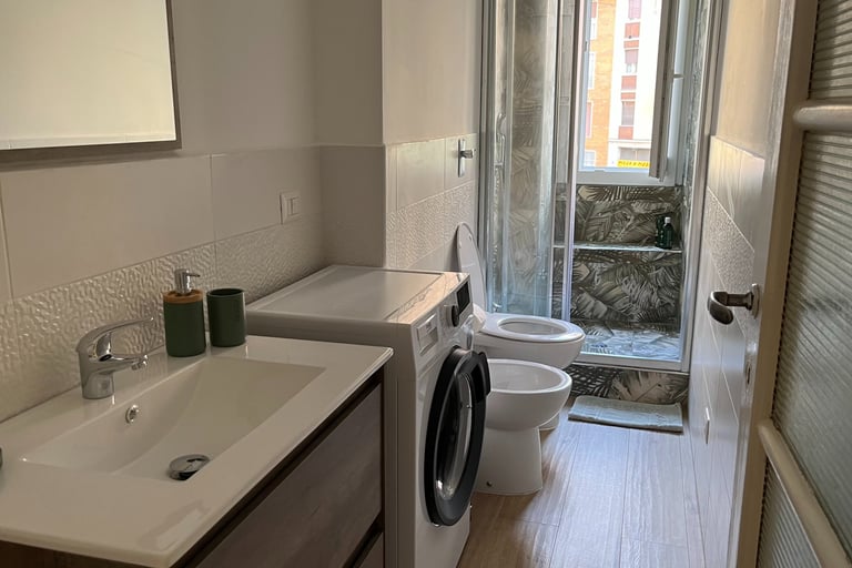In the bathroom, you'll find a shower, bidet, sink, washing machine, and dryer. Complimentary shampoo, shower gel, and a hairdryer are provided. There's a clothes rack with clothespins for damp towels or small laundry, and an ironing board and iron are also available.